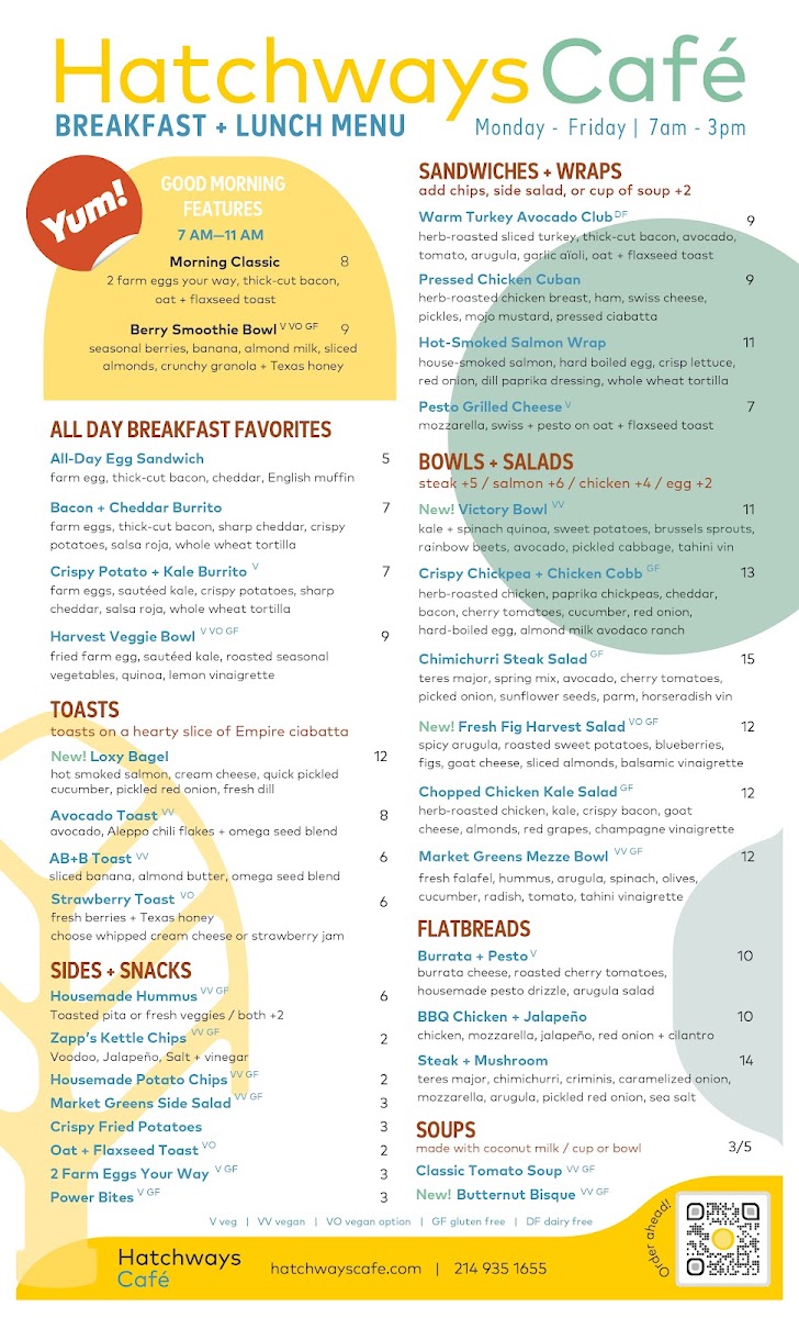 Welcome to Hatchways Café, a vibrant eatery nestled in Dallas' Victory Park. Known for its health-conscious menu, this café excels in offering delectable lunch options like their standout Halloumi Bahn Mi and Roasted Turkey Club, both artfully crafted to tantalize your taste buds. The sandwiches and wraps are paired perfectly with rich soups like the creamy Tomato Soup and the invigorating Turmeric Chicken Noodle.